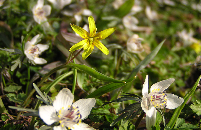 セツブンソウの群落に混じって、キバナノアマナが咲き出しました。
