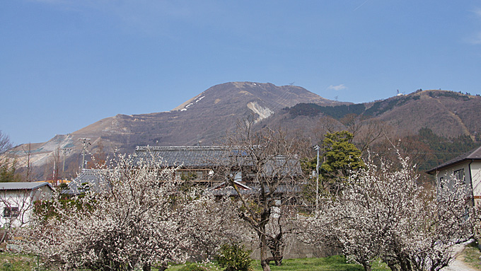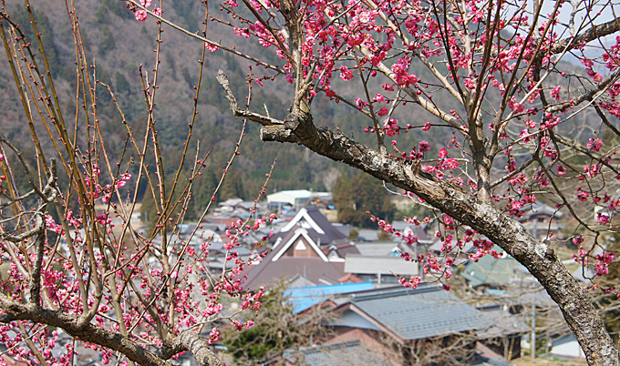 ![]() 紅梅は赤く、里の集落を見下ろしています。 |