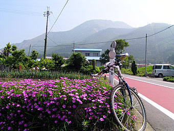 ![]() さて話をふりだしに戻して、ファミリーマートでおにぎりを買い込み、マウンテンバイクで登る前の記念写真です。堀江農機の前。 |